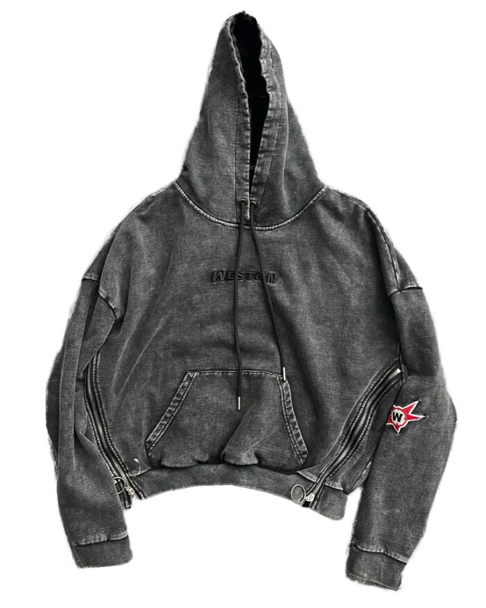 Custom 3D /puff embroidery acid wash hoodie zip on sleeve men’s heavyweight unisex hoodie